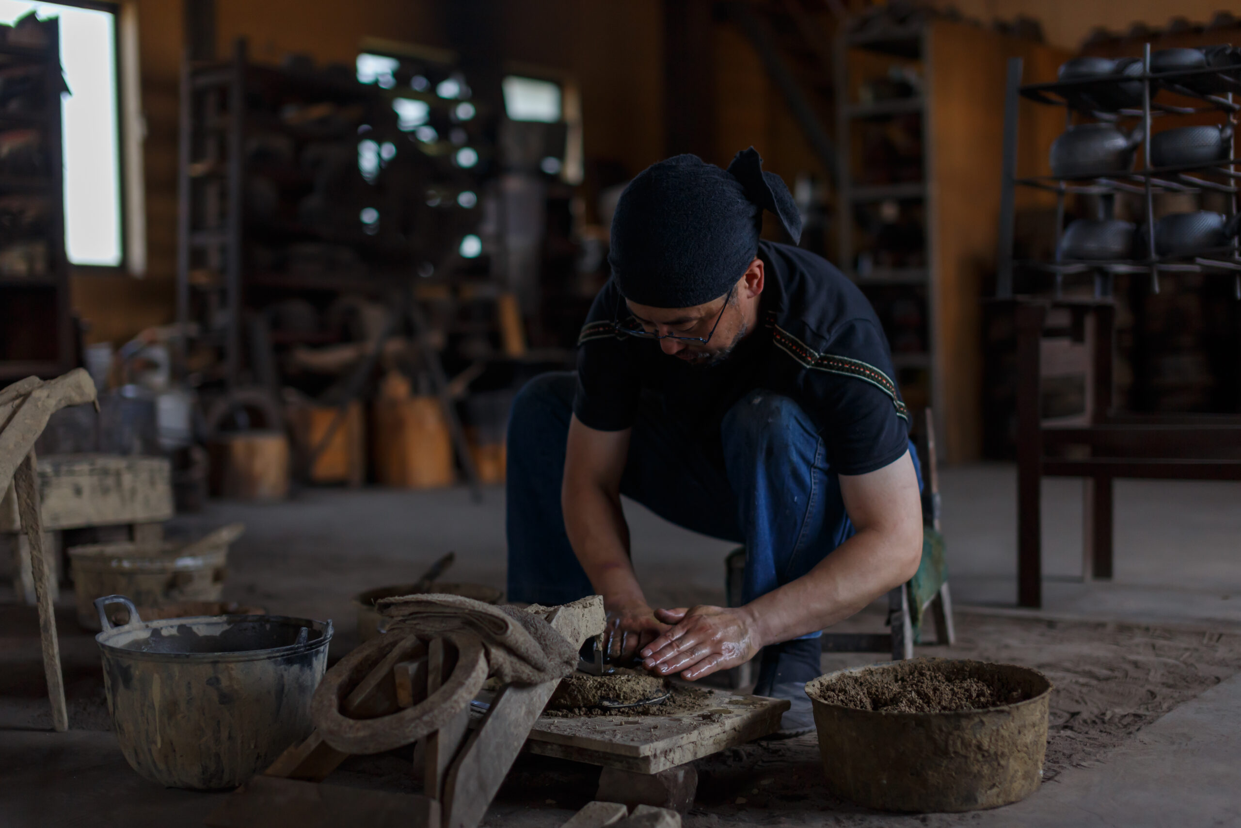 The ironware industry in my local area is characterized by mould making and colouring operations. There are two types of mould making techniques: yakigata (lit: firing moulds) and namagata (lit: raw moulds). Yakigata are made by hand, one mould at a time, using sand from the river and traditional tools, without the use of machines or electricity. This technique is mainly used to make iron kettles and kettles for tea gatherings. Namagata, also called metal moulds, is a technique to make moulds for mass production using machines and electricity. It is suitable for making iron pots, skillets that are popular now with the camping boom, wind chimes, paperweights, teapots, and other small items for mass production.