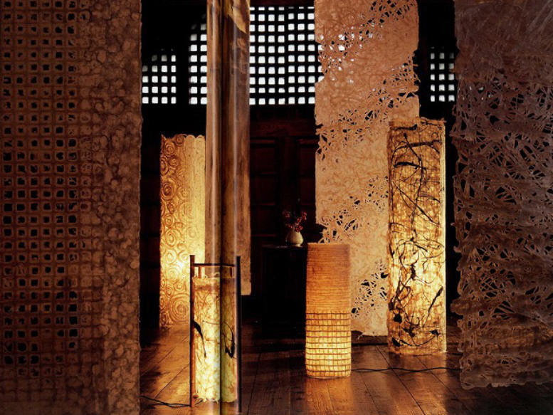 Echizen Washi is handmade from natural materials such as kozo (mulberry), mitsumata and ganpi. The handmade process is the most distinguishing feature of Washi. By making it by hand, a unique texture is created in the paper. Another appeal of Washi is its light transmission properties. Unlike regular paper, washi is made from natural materials, with its fibers intricately interwoven. This gives it unique properties, such as regulating humidity, blocking UV rays, and capturing dust from the air. However, the most characteristic feature is Washi’s ability to lower thermal conductivity and scatter light through the complex reflection of fibers, softly diffusing it. This characteristic plays an important role in lighting and interior design. In particular, Washi is widely used in lighting fixtures and interior elements, adding warmth to the space. For example, the interiors of Aman hotels and the stores of the luxury French brand “Guerlain.” Both designed by architect Kengo Kuma, incorporate Washi. Additionally, Washi has been used as a material in art, with renowned artists such as So-un Takeda and Richard Serra creating works using it.
